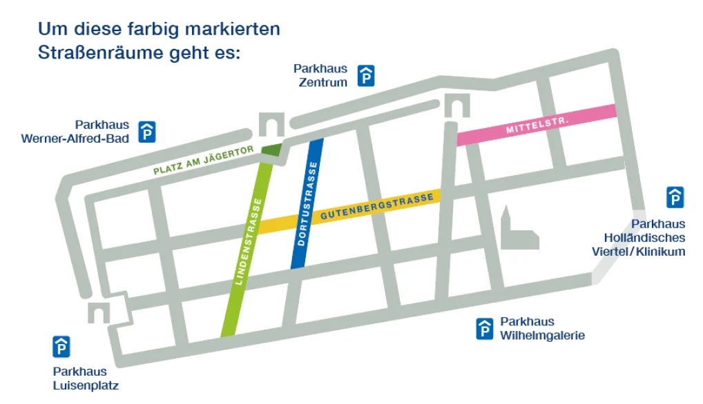 Weniger parkende Autos und Parksuchverkehr – dafür mehr Raum für Begegnung, Freizeit, Einkaufen, Gastronomie und Stadtgrün.