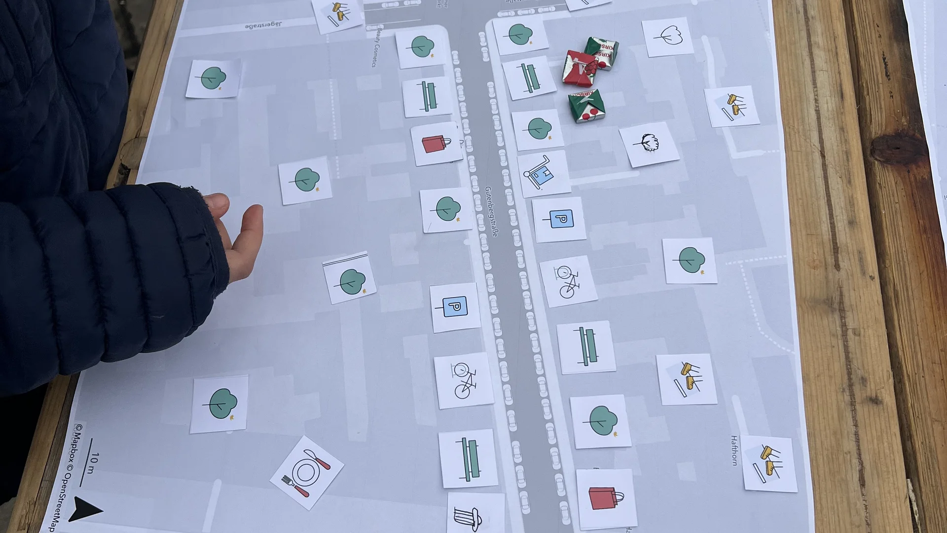 Beim „Planning for Real“-Prozess an Station drei schlüpften die Kinder in die Rolle von Stadtplanern. Mit bunten Piktogrammen entwickelten sie eigene Pläne für die Straßen rund um das Jägertor. Ihre Wünsche: Mehr Platz für Fußgänger, mehr Grün und zusätzliche Sitzbänke. Auch die Sauberkeit war ein Thema – Mülleimer standen weit oben auf der Wunschliste.